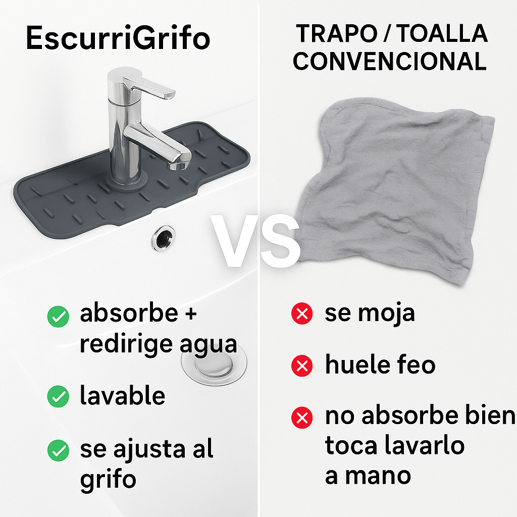 EscurriGrifo® → absorbe + redirige agua, lavable, se ajusta al grifo.