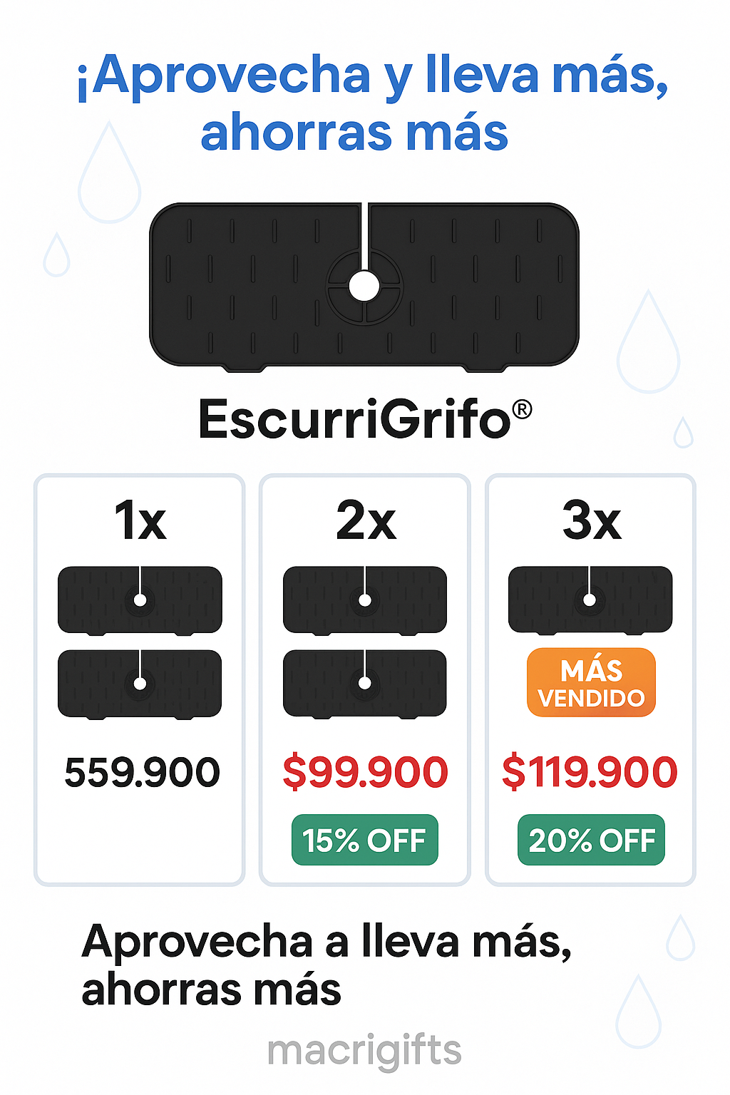 1x EscurriGrifo® 👉 $59.900 2x EscurriGrifo® 👉 $99.900 (15% OFF) 3x EscurriGrifo® 👉 $119.900 (20% OFF – ¡MÁS VENDIDO!) 🚚 Envío rápido y pago contraentrega en toda Colombia.